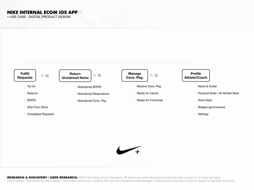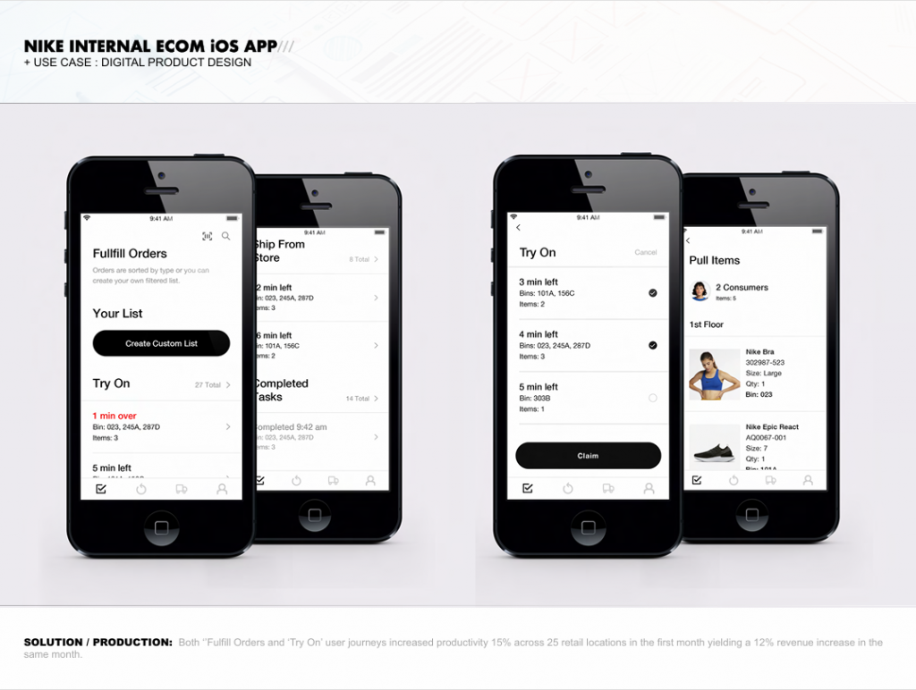I led the UX/UI design for Nike's internal fulfillment application, bridging the interface between Nike retail employees and digital consumers through various fulfillment channels including BOPIS, Ship to Store, and Try On services.